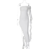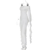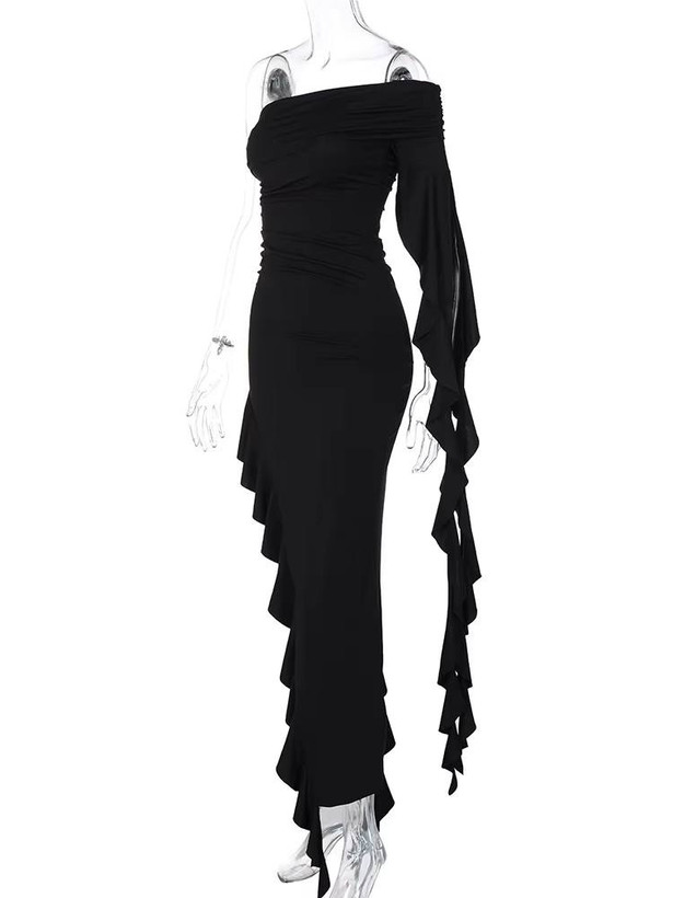 پیراهن ماکسی رومی دو آستین با طراحی حلزونی و چاکدار، مدلی خاص و متفاوت برای مهمانیها و مراسم رسمی است.