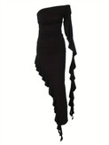 چاک بلند کنار پا و طراحی حلزونی در پایین لباس، ترکیبی از وقار و جذابیت ایجاد کرده است.